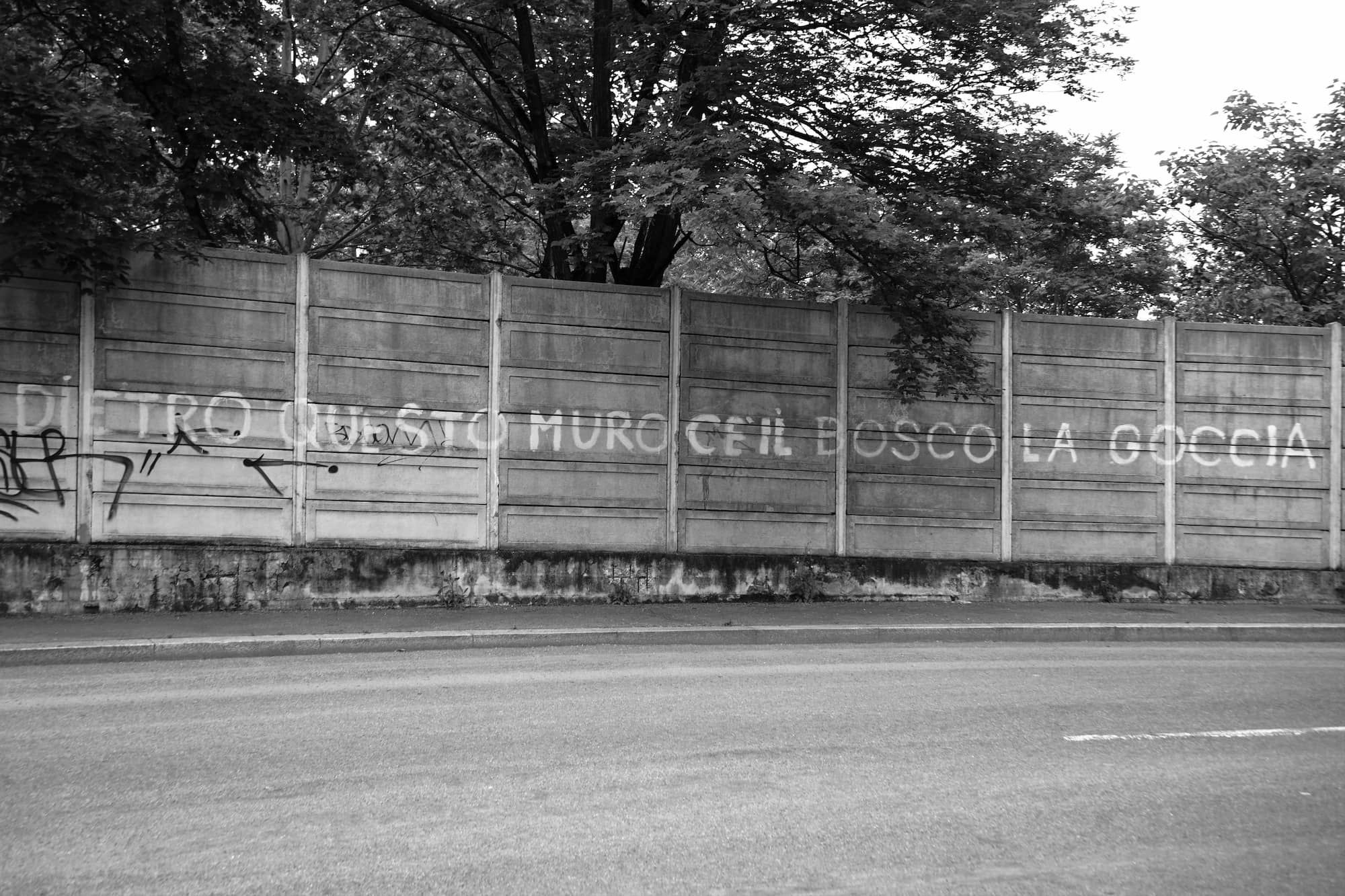 © Asja Castelli, Scritta lungo via Pacuvio (Milano) che testimonia la presenza di una foresta aldilà del muro di recinzione, 2020